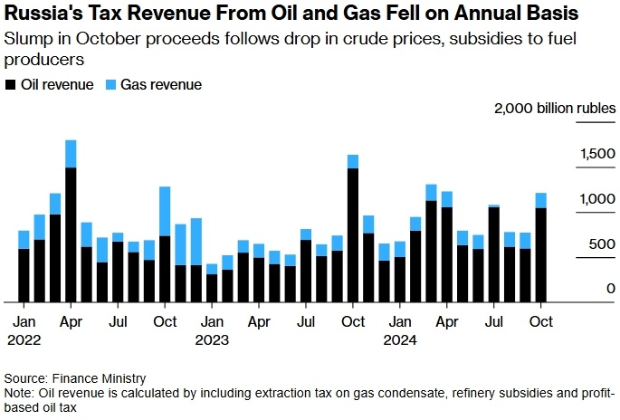 Средняя цена на нефть марки Urals составила $63,57 за баррель, что на 24% ниже, чем год назад. Субсидии нефтепереработчикам страны также снизили доходы бюджета Доходы российского правительства от нефтяной отрасли в октябре упали на 29% по сравнению с предыдущим годом из-за снижения цен на нефть и увеличения государственных выплат производителям топлива. Налоги на нефть, являющиеся ключевым источником финансирования бюджета, сократились в прошлом месяце до 1,05 триллиона рублей (10,7 миллиарда долларов) по сравнению с 1,48 триллиона рублей годом ранее, согласно расчетам Bloomberg, основанным на данных Министерства финансов, опубликованных во вторник. Общая сумма нефтегазовых поступлений, 86% которых приходится на сборы от добычи нефти и налог на прибыль, упала более чем на четверть до 1,21 триллиона рублей. Падение доходов произошло вслед за снижением цен на сырую нефть на фоне падения спроса в Китае, являющемся основным потребителем, и роста поставок из США, Бразилии, Канады и Гайаны.