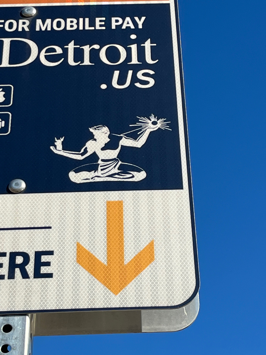 Детройт — падшая автомобильная столица мира. Встречает нас парковочным знаком с иконкой мужика: в одной руке — «Газель», во второй — мирный атом Дубны. Всегда приятно, когда в Америке с таким пиететом относятся к нашей культуре. Мы с этим мужиком сегодня ещё встретимся.