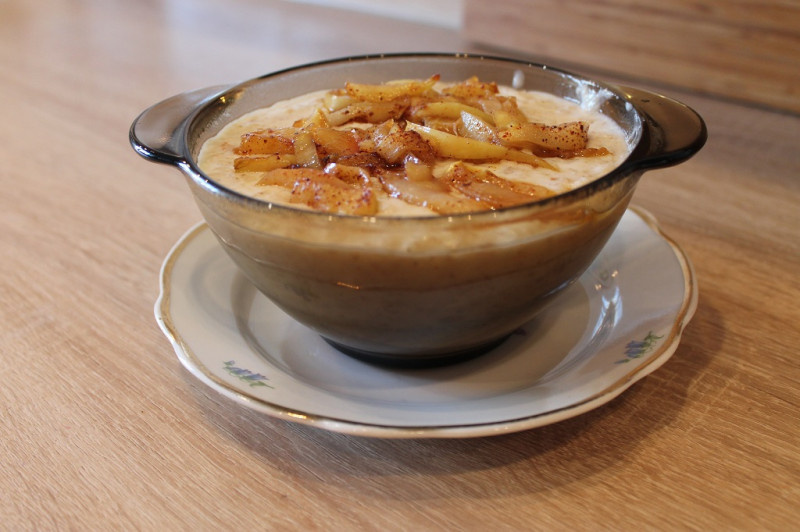 Эту начинку я делала на сковороде, пока варилась каша в мультиварке. Рецептом это вряд ли можно назвать, не рецепт, а... совет, что ли. На начинку потратила считанные минуты, зато это разнообразие для каш. На фото каша из овсяных хлопьев. Начинку можно делать для любой молочной каши, а также добавлять в йогурт или творог. Продукты - пропорции указаны примерно, большой простор для импровизации: Яблоки - у меня было 3 небольших (на 3 порции каши), Сливочное масло для жарки - грамм 25-50, Коричневый сахар (можно и обычный) - 1-2 ст. ложки, Корица - 1/2 ч. ложки, Можно добавить жменьку изюма. Яблоки разрезать и вынуть сердцевину. Поставить на огонь сковородку со сливочным маслом. Яблоки разрезать тонкими пластинками или соломкой. Жарить на сильном огне 1 минуту. Если с изюмом, то его теперь добавить. Сделать маленький огонь, закрыть крышкой. Через 2 минуты открыть крышку, посыпать яблоки сахаром и корицей, закрыть крышку, выключить огонь. Яблоки лучше не перемешивать, чтобы они сами не