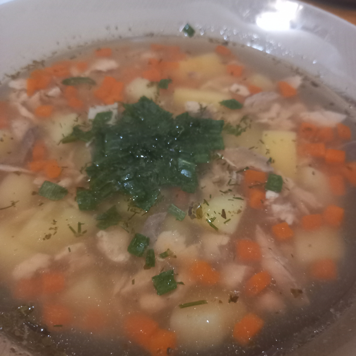 В процеженный бульон добавляем нарезанную кубиком морковь и картофель. Варим минут 10, пока не сварится картофель.