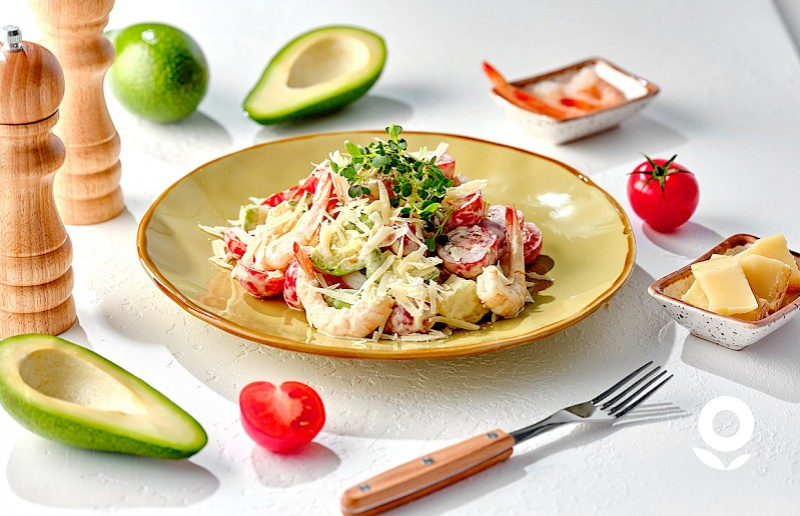 Все ингредиенты найдутся в холодильнике. А если чего-то не хватает, «Лента» оперативно привезёт с доставкой: — 400 г картофеля — 2 авокадо — 8 помидоров черри — 300 г креветок — 300 г твёрдого сыра — микрозелень для украшения — соль, молотый чёрный перец — 1 зубчик чеснока — 2 ст. л. майонеза — 1 ст. л. воды без газа 1. Картофель вымойте щёткой и варите в мундире 20–25 минут. Немного остудите, очистите и нарежьте средними кусочками. 2. Авокадо очистите от кожуры, разрежьте пополам, удалите косточку, мякоть нарежьте такими же кусочками, что и картофель. Черри разрежьте пополам. 3. Креветки очистите от панцирей, удалите головы и кишечные вены. Хвостики можно оставить. Обжаривайте креветки на сухой сковороде 3–4 минуты, помешивая. Посолите и поперчите. 4. Для соуса чеснок очистите и разотрите в ступке в однородное пюре. Смешайте майонез с чесноком и ложкой воды до консистенции кефира. 5. Выложите картофель, авокадо, креветки и помидоры в виде стога сена, полейте соусом, посыпьте тёртым сы