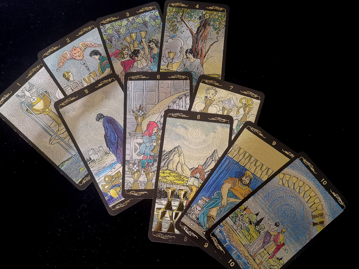 Числовой ряд от одного до десяти тысячелетиями завораживал людей. Основополагающая интерпретация его восходит к Пифагору, основателю одной из первых известных в истории мистических школ, и, разумеется как каббале (десять сефирот Древа Жизни). Две эти системы далеко не всегда совпадают друг с другом. Работая с колодой марсельского типа, где картинок на числовых картах нет, гадатель вправе выбрать систему нумерологии и применить её принципы к любой карте, приходящей в раскладе. Если вы решите что двойка означает выбор, то Двойку Кубков нужно будет толковать как эмоциональный выбор или выбор между двумя любовниками. Большинство современных колод следует райдеровской модели, в которой каждая карта снабжена иллюстрацией. Всё-таки основу современной традиции Таро заложила именно эта колода. Насколько мне известно, не сохранилось никаких источников о том, как Памела Смит выбирала сюжеты для своих карт. Картинки, нарисованные ей, выходят за рамки обязательных формул, приводимых в качестве ста