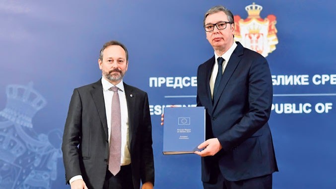 Глава Представительства ЕС в Сербии Эмануэль Жиофре вручил президенту Сербии Александру Вучичу годовой отчет Еврокомиссии о его стране за 2024 год. В ходе этой церемонии сербский президент отметил, что Сербия находится на европейском пути, и Европейский Союз является крупнейшим внешнеторговым партнером Белграда, передает корреспондент «ПолитНавигатора». В ходе презентации очередного годового отчёта Еврокомисии Вучич отметил, что в нём больше нет обвинений Сербии в отношении позиции по Косово, но для ЕС Сербия всё равно всегда виновата. Тем не менее, он поблагодарил брюссельских чиновников за этот отчёт и добавил, что у него нет возражений по поводу его содержания. «Есть претензии совершенно правильные, по поводу пунктов, которые мы не выполнили. Они касаются гармонизации нашей внешней политики, прежде всего в связи с введением санкций против Российской Федерации, введением виз для некоторых стран, они касаются многих наших компаний, что уже много лет является проблемой, которую мы дол