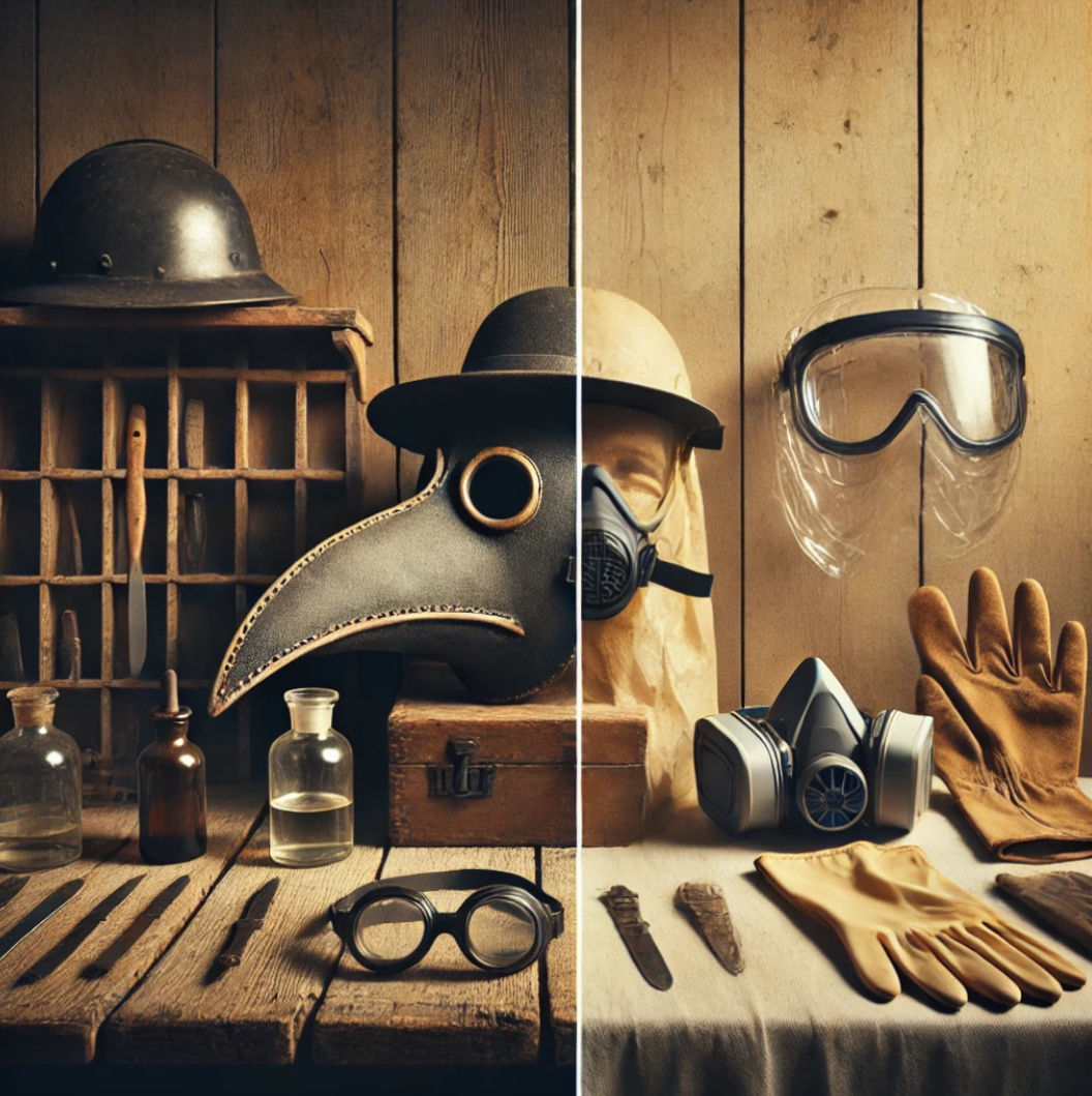 В Средние века ремесленники, кузнецы и стеклодувы начали использовать примитивные формы СИЗ, такие как кожаные фартуки, перчатки и маски, чтобы защитить себя от ожогов, порезов и вредных испарений. Например, врачи во время эпидемий чумы носили специальные маски с клювом, наполненным ароматными травами, считая, что это защитит их от болезней.