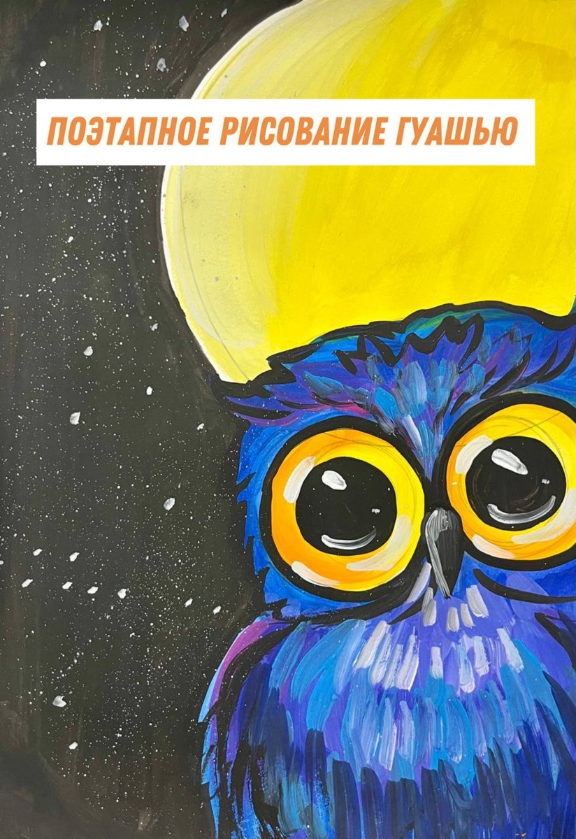 Пошаговое выполнение иллюстрации совенка гуашью.
