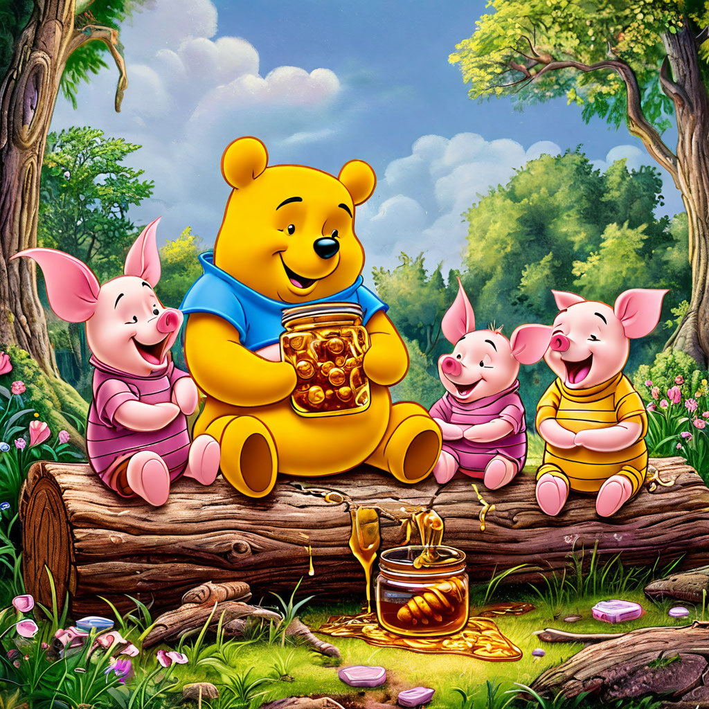 Однажды, ранним утром, Артём проснулся от тихого ворчания Арчи. Пёсик сидел у кровати и, потягиваясь, виновато смотрел на своего хозяина. — Чего тебе, Арчи? — сонно пробормотал Артём, вытянувшись и зевая. Арчи в ответ только фыркнул и поскакал к двери. Рядом с его миской лежал аккуратно сложенный свиток, привязанный кулинарной верёвочкой. Сверху золотыми буквами было написано: "Для настоящих сыщиков!" Артём быстро распечатал свиток, на котором было сказано: «Дорогие Артём и Арчи! В волшебном лесу случилось неслыханное происшествие — у Винни-Пуха пропал весь запас меда! А еще по лесу прошел слух, что вокруг его домика подозрительно крутятся три поросенка. Мы ждём вас в домике Пуха. С уважением, Филин.» — Ууу, вот это интрига! — прошептал Артём. Он быстро оделся, и они с Арчи переместились в Волшебный лес. В домике Винни-Пуха царил беспорядок. Пух сидел в углу с печальным видом и тихо вздыхал. Рядом стояли Тигра, Филин и трое поросят — Наф-Наф, Ниф-Ниф и Нуф-Нуф. — Какое несчастье! Мой м