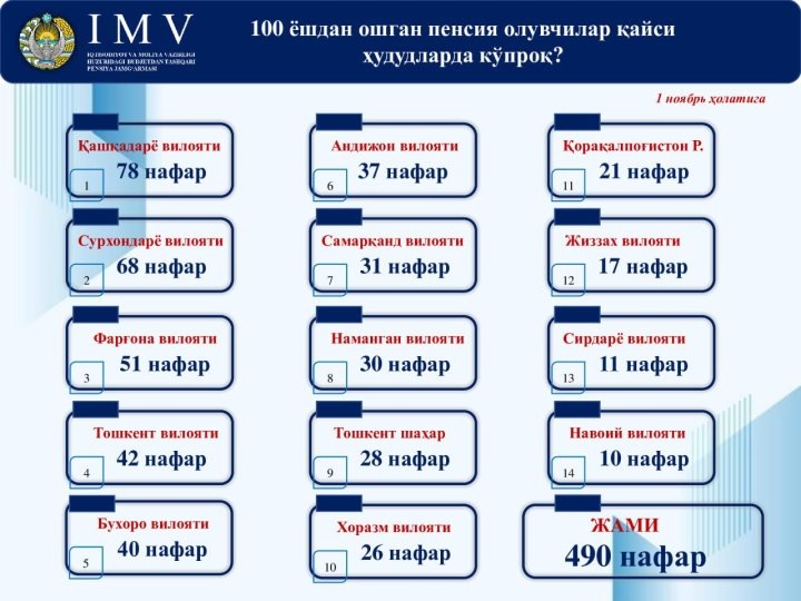 Согласно свежему отчёту Агентства по управлению пенсионными фондами при Министерстве финансов Республики Узбекистан от 5 ноября 2024 года, 490 граждан страны достигли векового юбилея и продолжают получать пенсионные выплаты. Эти данные позволяют проанализировать распределение долгожителей по регионам республики и выявить определённые тенденции. География долголетия: лидеры и аутсайдеры