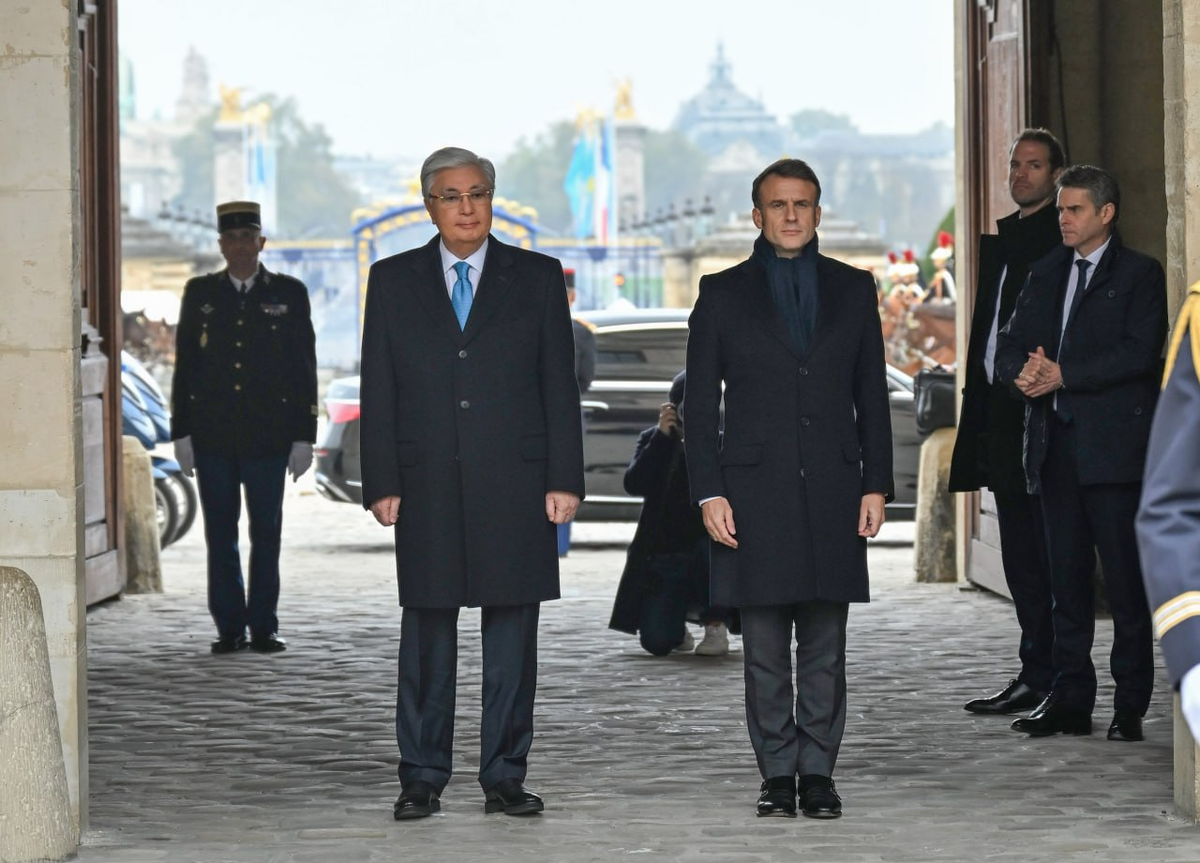 На кадрах Макрон встречает главу Казахстана под фанфары военного оркестра.
