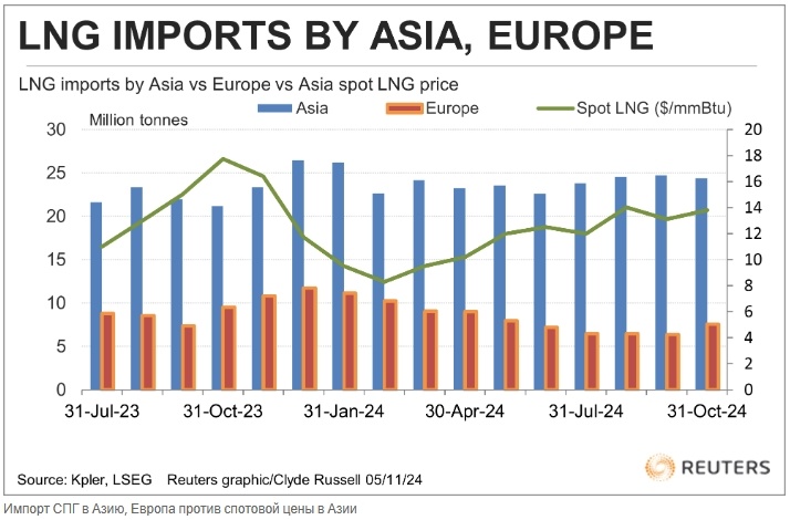 Рост импорта в Европу и спад в Азию — это поворотный момент в недавней тенденции, однако сдвиг в октябре недостаточен, чтобы изменить картину слабой Европы и сильной Азии с начала года. В октябре импорт сжиженного природного газа в Европу увеличился впервые за 10 месяцев. В то же время импорт в Азию сократился, но не настолько, чтобы компенсировать рост общего объёма. Это изменение в тенденциях импорта в Европу и Азию можно рассматривать как поворотный момент, но оно всё ещё недостаточно значительно, чтобы изменить картину, сложившуюся в начале года, когда Европа была в слабом положении, а Азия — в сильном. Увеличение импорта в Европу и снижение в Азию — это важный сдвиг в недавних тенденциях, но он всё ещё недостаточен для изменения общей картины, где Европа была в слабой позиции, а Азия — в сильной. Данные, собранные аналитиками сырьевых товаров Kpler, показывают, что в октябре объём поставок СПГ в Европу составил 7,54 миллиона тонн, что выше, чем в сентябре (6,37 миллиона тонн), и э