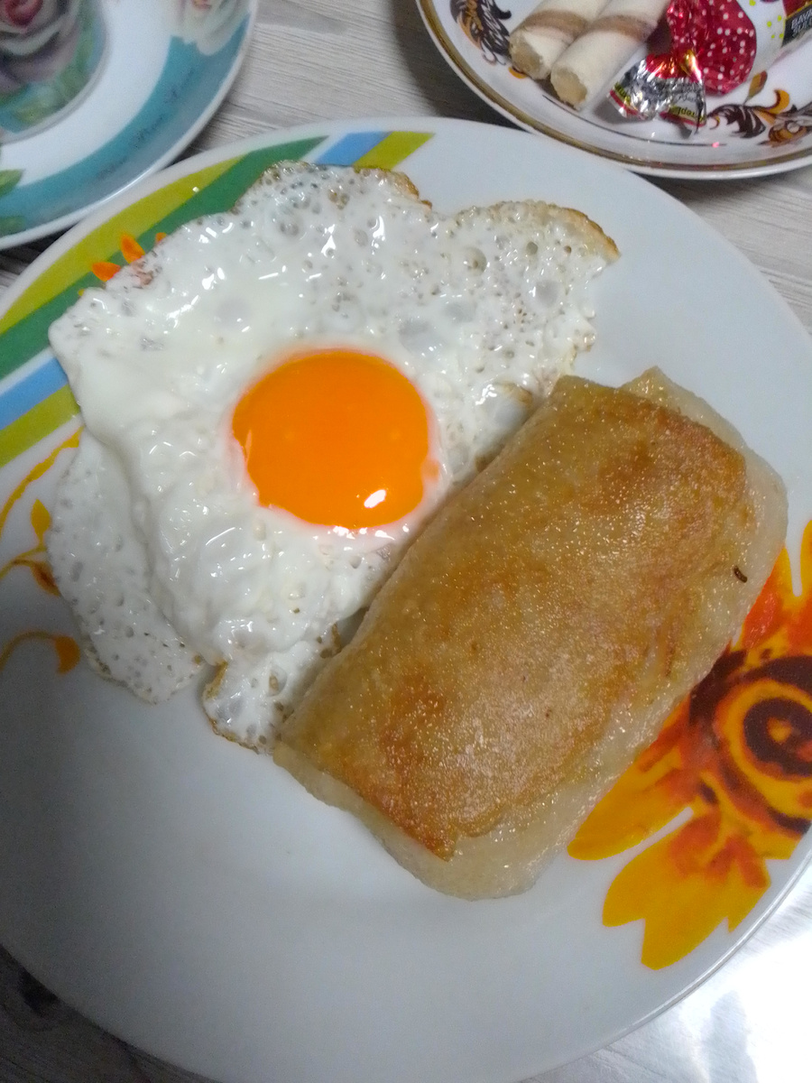 Завтрак у меня сегодня простой, но вкусный: фаршированный блинчик с капустой, обжаренный на смеси сливочного и растительного масла с двух сторон и глазунья,