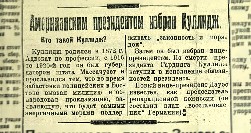 Президентская агитация ведется уже почти целый год. До сих пор в С[оединенные] Штатах у власти (в палатах и на президентском кресле) чередовались две „партии“ — республиканская и демократическая. Партия — в кавычках, ибо в Америке дело не в программе, а в отдельных обещаниях и удачливости политики стоящих у власти личностей. Но, в общем, можно сказать, что республиканская партия с нынешним заместителем президента Кулиджем (он же и кандидат ее) на нынешних выборах на должность президента есть партия крупнейшей буржуазии, партии патриотическая и открыто черносотенная, словом, „истинно-американская“.