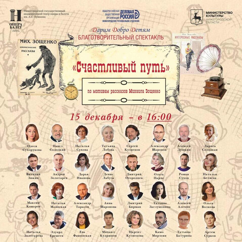 15 декабря в 16:00 предприниматели и политики представят на сцене Нижегородского государственного академического театра оперы и балета им. А.С. Пушкина благотворительный спектакль «Счастливый путь» (по мотивам произведений Михаила Зощенко). Об этом сообщает Нижегородское региональное отделение «Деловой России». В спектакле примут участие известные нижегородские предприниматели и политики, которые уже не первый год демонстрируют свои актерские таланты на благотворительных сценах: К ним присоединятся и новые лица: собственница автошколы «Колесо» Ева Фаминская, владелец ООО «Креатив» Дмитрий Бирман, учредитель компаний «Медис» и «ЛДЦ МИБС» Алексей Душкин. Режиссером-постановщиком спектакля выступит театральный деятель Олег Ринге (Тольятти). После представления в оперном учащимся детских художественных и музыкальных школ, победителям Всероссийских и международных конкурсов вручат адресные подарки — музыкальные инструменты. Список детей, нуждающихся в поддержке, подготовил учебно-методичес
