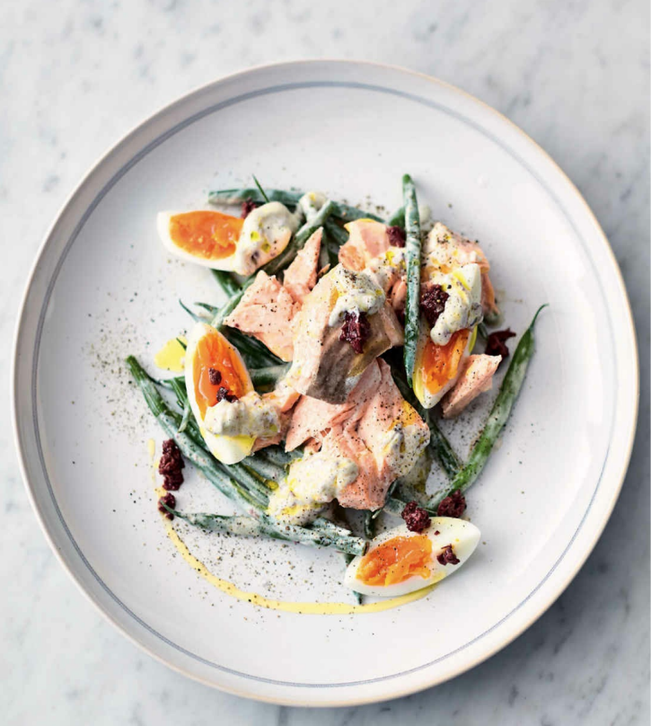 - Переложите лосося на разделочную доску. Слейте воду с яиц и фасоли, используя дуршлаг.