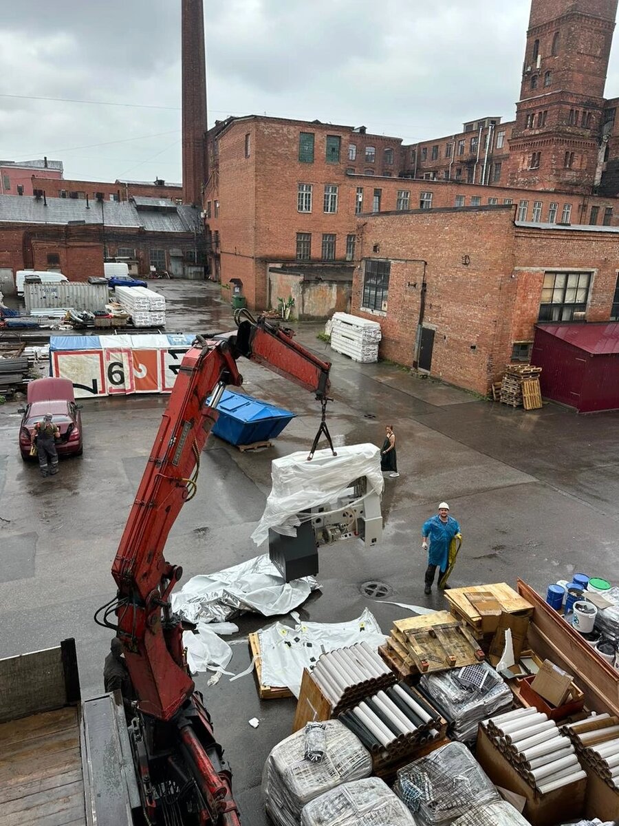 Этот внушительный агрегат весит целых 2,2 тонны. Пришлось доставлять его с помощью подъемного крана, что придало зрелищности процессу: сотрудники соседних фирм то и дело выходили на улицу, чтобы посмотреть на установку🏗 Такое обновление - важный шаг для нашей производственной линии.