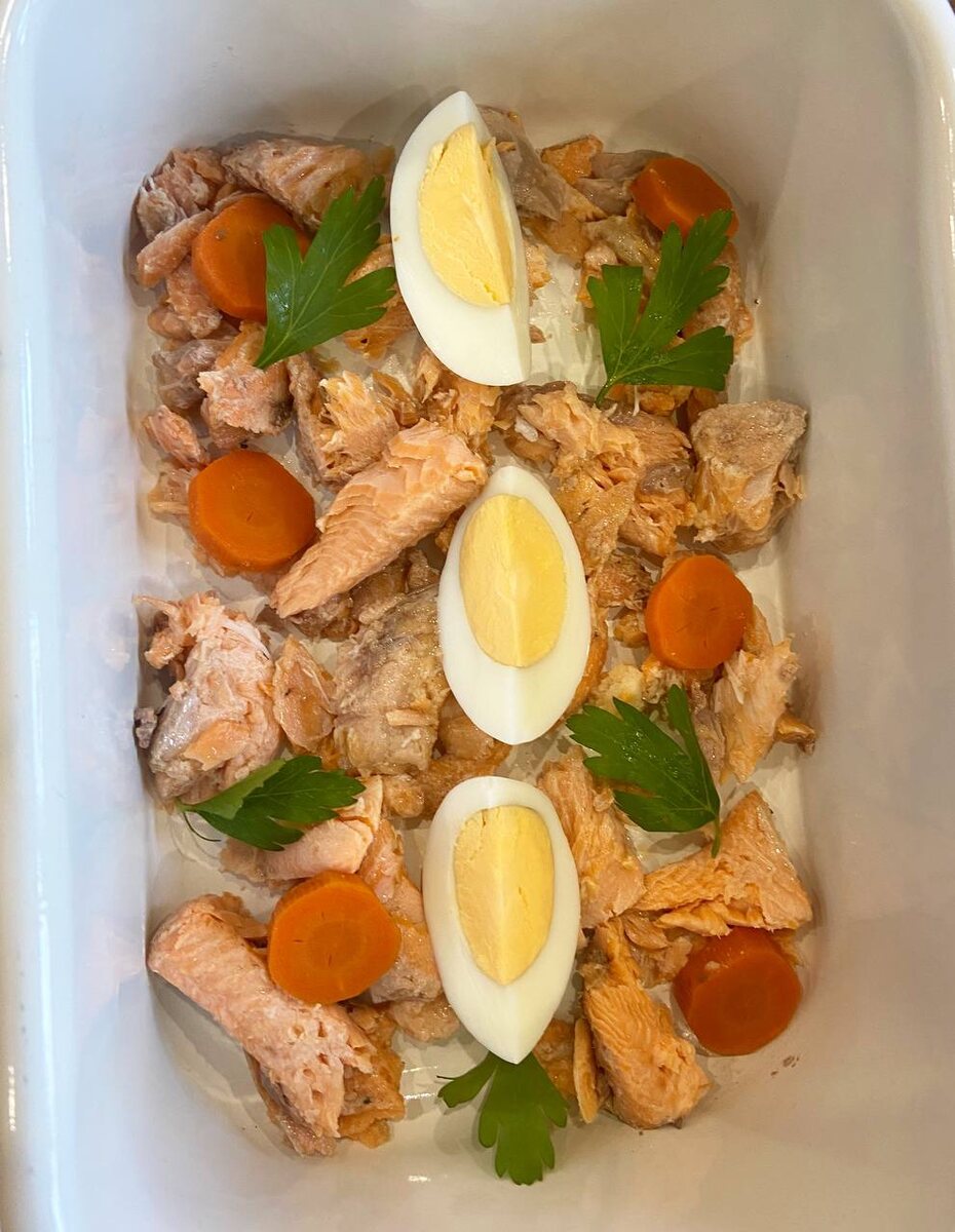 Звучит богато, но у меня это довольно бюджетное блюдо. Дело в том, что некоторое время я коплю головы, хребты и хвосты форели в морозилке. Покупаю рыбу, разделываю на филе или стейки, а остальное в заморозку. Вот и сейчас возникла необходимость расчистить запасы, поэтому я решила сварить заливное. Рыбные запчасти я уложила в чашу мультиварки-скороварки, залила водой так, чтобы только покрыть рыбу, добавила морковь, лавровый лист, чёрный перец горошком, хорошо посолила и готовила 1,5 часа. Если варить в обычной кастрюле, тогда около часа. Мне нравится использовать скороварку, потому что косточки развариваются до абсолютной мягкости и если вдруг случайно попадут в готовое заливное, их даже никто не заметит и тем более не поразится. В кастрюле такого эффекта не достичь, поэтому варить больше часа не вижу смысла. Далее я достаю рыбу, разбираю мясо от костей, выкладываю в форму для холодца, добавляю на свой вкус кружочки отварной моркови, отварные яйца, петрушку. Бульон проц