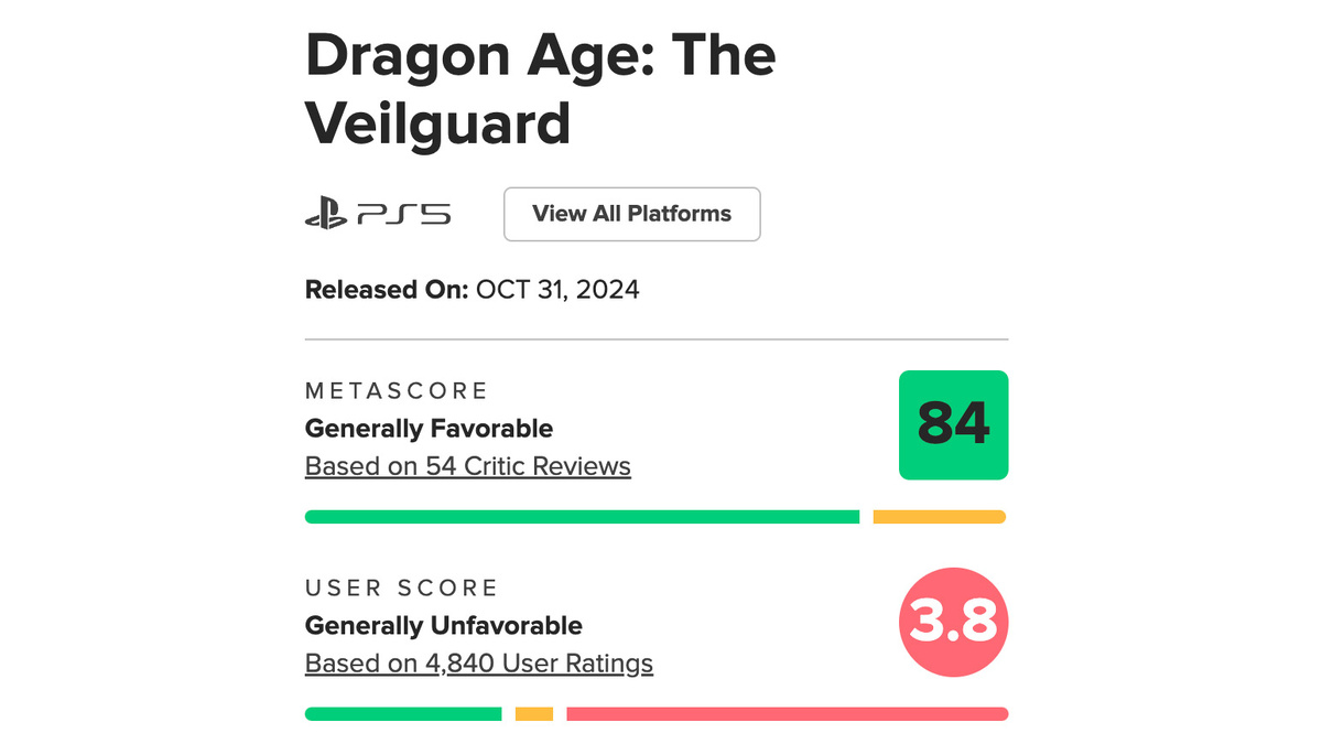 Несмотря на высокие оценки от критиков, пользовательский рейтинг Dragon Age: The Veilguard на Metacritic упал до 3.8, или "в целом неблагоприятного", после волны негативных отзывов. Владелец Metacritic, компания Fandom, отреагировала на ситуацию, заявив, что все пользовательские рецензии проходят модерацию и что оскорбительные отзывы будут удалены. Сейчас у Dragon Age: The Veilguard средний балл в 84 из 100 на основе 54 рецензий критиков версии для PS5, что относит игру к высокой категории. В Steam у игры 74% положительных отзывов, что соответствует рейтингу "в основном положительный". Однако на Metacritic, в отличие от Steam, пользователи могут оставлять отзывы, не владея игрой. Это привело к более чем 4,775 отзывам, из которых 64% оказались негативными. Основные претензии касаются "идеологической направленности" игры, при этом пользователи критикуют ее сценарий, повествование и вторично — дизайн уровней. В заявлении для Eurogamer компания Fandom прокомментировала ситуацию, подчеркнув