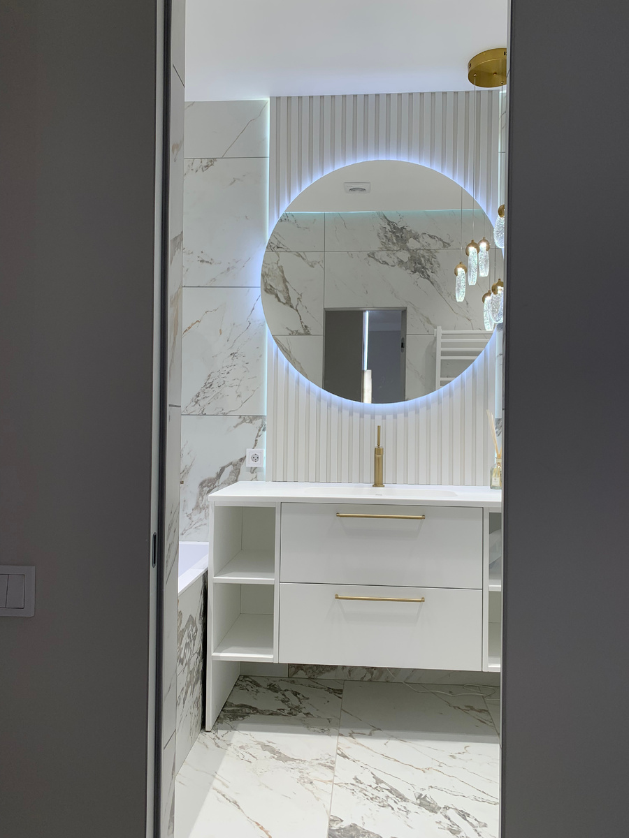 Также реализовали идею полок с подсветкой, сделали портал для двери-невидимки с запилами под 45 градусов. Швы заполнили двухкомпонентной эпоксидной затиркой. Люк-невидимку подобрали с удобной конструкцией: при открытии достаточно одного нажатия пальцем в любую точку плитки, где установлен люк.