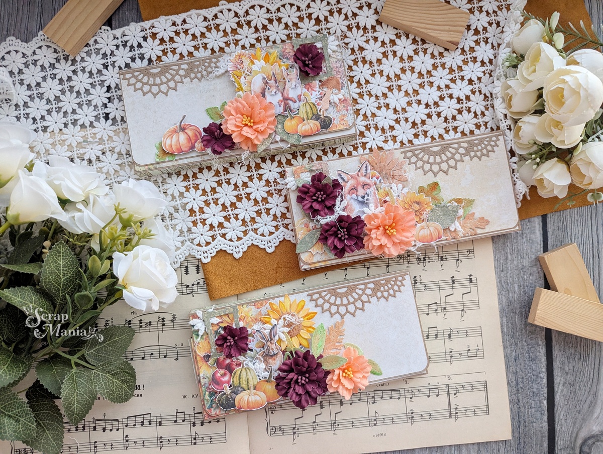 Всем привет, с вами Гредасова Катрин. На дворе осень и я с яркой работой из потрясающей коллекции "В гостях у осени". Подготовила три шоколадницы с милыми лесными персонажами в окружении цветов, различных овощей и зелени. Ранняя солнечная осень ассоциируется с чем-то теплым, крафтовым, поэтому основой моих шоколадниц являются крафтовые листы. Часть вырубки у меня раскрашена вручную акварельными красками. Рассмотрим подробнее первую шоколадницу. В качестве главных героев здесь выступают очаровательные белочки, которые сидят и внимательно следят за происходящим (белочек вырезала из листа с картинками 10х30 см "В гостях у осени. Зверюшки"), за ними можно увидеть яркие георгины с листа с картинками 10х30 см "В гостях у осени. Георгины". И не смогла я обойтись во всех шоколадниах без крутого ножа "Ситцевое лето. Цветок подсолнуха", который придает особенный шарм. Потрясающе смотрится здесь и нож "Кружевной узор. Бордюр", для которого я выделила отдельное, "видное" место. И как в осенних (д