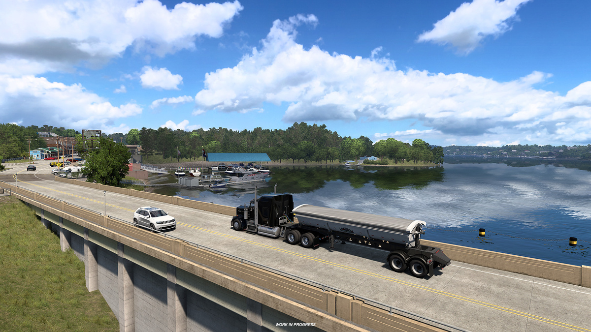 Хотите сделать перерыв в дороге и спокойно провести время у воды? Сегодня мы с радостью проведём вас по самым знаковым и живописным водным объектам штата Миссури, прекрасно воссозданным нашими разработчиками карт для грядущего дополнения American Truck Simulator! Самым известным из них является Озарксское озеро — большой водоём, образованный в результате перекрытия плотиной реки Осейдж. Оно было создано плотиной Бэгнелл, строительство которой было завершено в 1931 году. Если смотреть на озеро сверху, оно имеет форму дракона и расположено в центре штата Миссури в горах Озарк. Его площадь составляет 54 тысячи акров (220 квадратных километров). Ещё одним крупным водохранилищем, включённым в это дополнение к карте, является плотина и водохранилище Гарри С. Трумэна, расположенные вдоль реки Осейдж, к западу от Озаркского озера. Площадь этого огромного водоёма составляет более 55 тысяч акров (225 квадратных километров), что примерно соответствует площади Озаркского озера. Помимо этих двух во