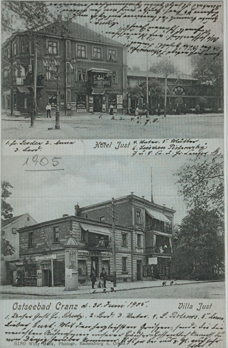 Ещё одна находка из Бильдархива, открытка с датой 30 июня 1905 г, из которой мы узнаем, что кроме отеля Just была ещё и вилла Just. Интересная деталь. А. Горбовский в книге "Кранц 1871-1918", ссылаясь на схему Фолькмана 1896 года, пишет, что здание, которое на фото снизу подписано, как Villa Just, было пансионатом Pontanus. Тут возможны 2 варианта: здание поменяло владельца/название или у Фолькмана речь шла о другом здании. Что удалось разобрать в подписи: "30 июня 1905 Дорогой Берт. С самой тёплой улыбкой передай привет... " Также в верхней и нижней части фотографии - открытки пронумерованы и перечислены все, кто изображен. И тут тоже есть интересная деталь: на фасаде виллы Just можно разобрать вывеску Hermann Piotrowski А. Горбовский, в книге "Кранц 1871-1918" со ссылкой на Путеводитель по Кранцу 1898 года пишет, что была обувная лавка Hermann Piotrowski, которая предлагала покупателям большой ассортимент обуви. А в Путеводителе по Кенигсбергу и прилегающим морским курортам дл