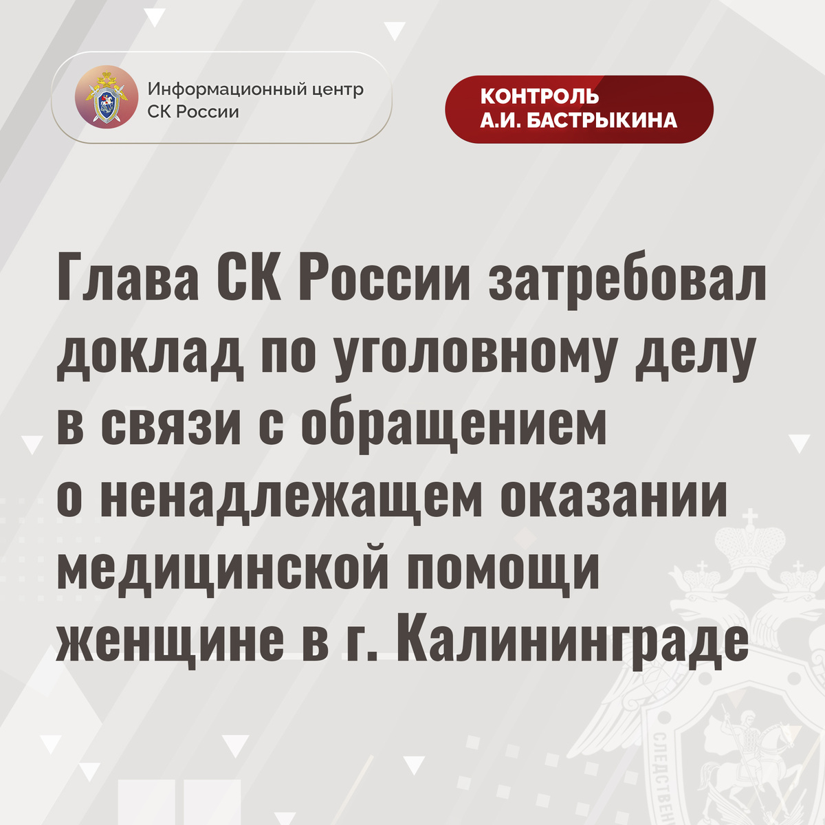 Глава СК России затребовал доклад по уголовному делу в связи с обращением о ненадлежащем оказании медицинской помощи женщине в г. Калининграде К Председателю СК России А.И. Бастрыкину в его приемную «ВКонтакте» обратился житель Калининградской области. Он выражает несогласие с ходом установления обстоятельств некачественного оказания медицинской помощи его 52-летней супруге в городе Калининграде в 2022 году, что привело к ее инвалидности. Заявитель отмечает затяжной характер расследования. В СУ СК России по Калининградской области по данному факту расследуется уголовное дело. Председатель Следственного комитета Российской Федерации Александр Иванович Бастрыкин затребовал у и.о. руководителя СУ СК России по Калининградской области Дмитрия Георгиевича Канонерова доклад о проведенном по уголовному делу комплексе следственных действий и установленных обстоятельствах, а также о причинах допущенной по нему волокиты. Исполнение поручения поставлено на контроль в центральном аппарате ведомства