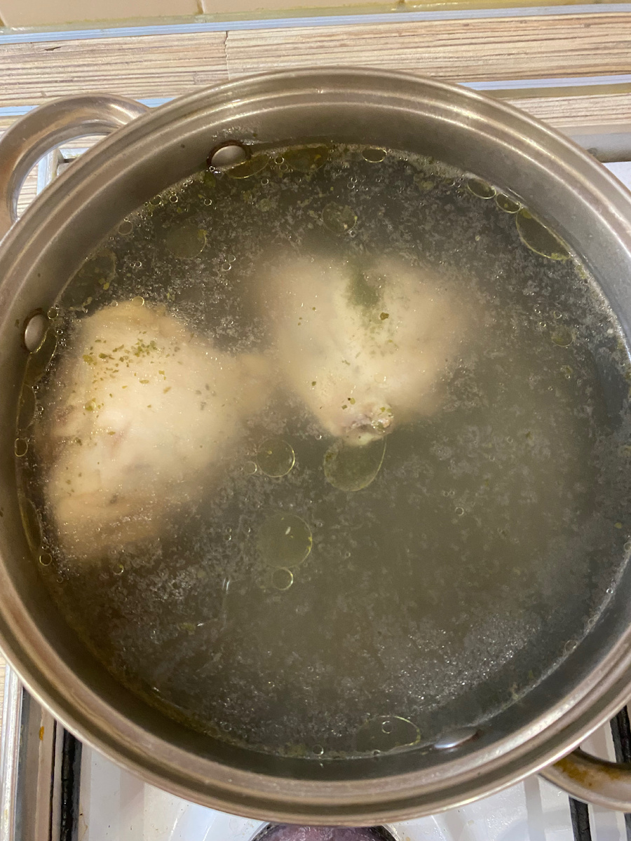 Начнем с бульона: отварить 2 крупных куриных бедра без кожи (предварительно промыть бедра водой), залить холодной водой, положить 2 лавровых листа, соль 1 столовая ложка, перец, приправа универсальна 1/3 чайной ложки и варить после закипания 30 минут. Вот такой бульон получился👇