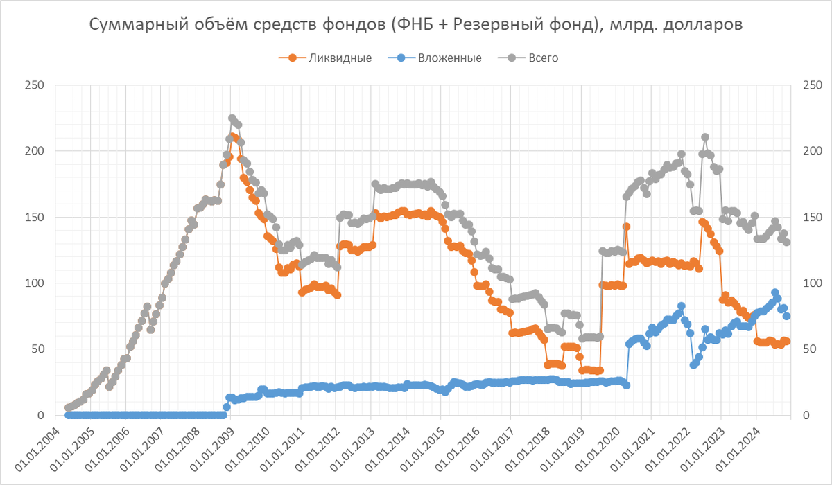 Минфин опубликовал данные по итогам октября, рассмотрим их бегло, т.к. основные движения происходят в декабре (что и по графикам видно), значит, вскоре многие величины могут измениться. Для начала - наши фонды (сейчас - только ФНБ). Его ликвидная часть, если мерить не в долларах, а в натуральных величинах. Как видим, рост цен на золото компенсировал его натуральное сокращение с начала года (процентов на 20 в этом году, минус ~75 т от ~360 т). Нефтегазовые доходы в руб. за предыдущие 12 мес. И помесячно по основным компонентам. Как видно, основная причина снижения в октябре - нефть и ещё немного НДД (налог на доп.добычу), оплачиваемый по итогам прошедшего квартала. Бюджет вернулся к дефициту, правда, пока небольшому, в планах на год - больше, примерно как и в предыдущие годы, 3 трлн с хвостиком. Рост к прошлому году потихоньку уменьшается, но всё ещё остаётся большим, 20-30%, выше инфляции по Росстату.