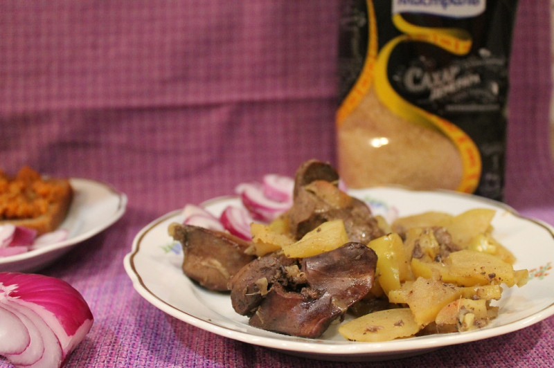 Печень индейки или куриная. Готовила в мультиварке, можно в посуде, где мясо тушите, например, глубокой толстостенной сковороде. Печенка, конечно, продукт полезный. Но как заставить семью её есть? Есть несколько способов, например, шантаж - "я у плиты стояла, старалась, а вы!..." и так далее. Предлагаю еще один способ - заинтриговать своих необычным вкусом. Вместо гарнира или как дополнение к гарниру - сладкое яблоко с имбирем. Продукты: Печень индюшиная (или куриная) — 700 гр; Яблоки - 5 шт если мелкие, а если крупные, то 2-3 шт; Имбирь (корень, примерно 3 см) — 1 зуб; Сахар коричневый (можно обычный) — 4 ст. ложки; Вино белое сухое — 200 мл или чуть уксуса - одну/две ст. ложки, желательно фруктового (яблочный, виноградный); Масло сливочное — 50 гр ; Соль по вкусу; Перец черный по вкусу, желательно свежемолотый. Краткая последовательность - в мультиварку загрузить яблочно-имбирный гарнир и пока он готовится, поджарить на сковороде печенку; печенку сложить в мультиварку к яблокам