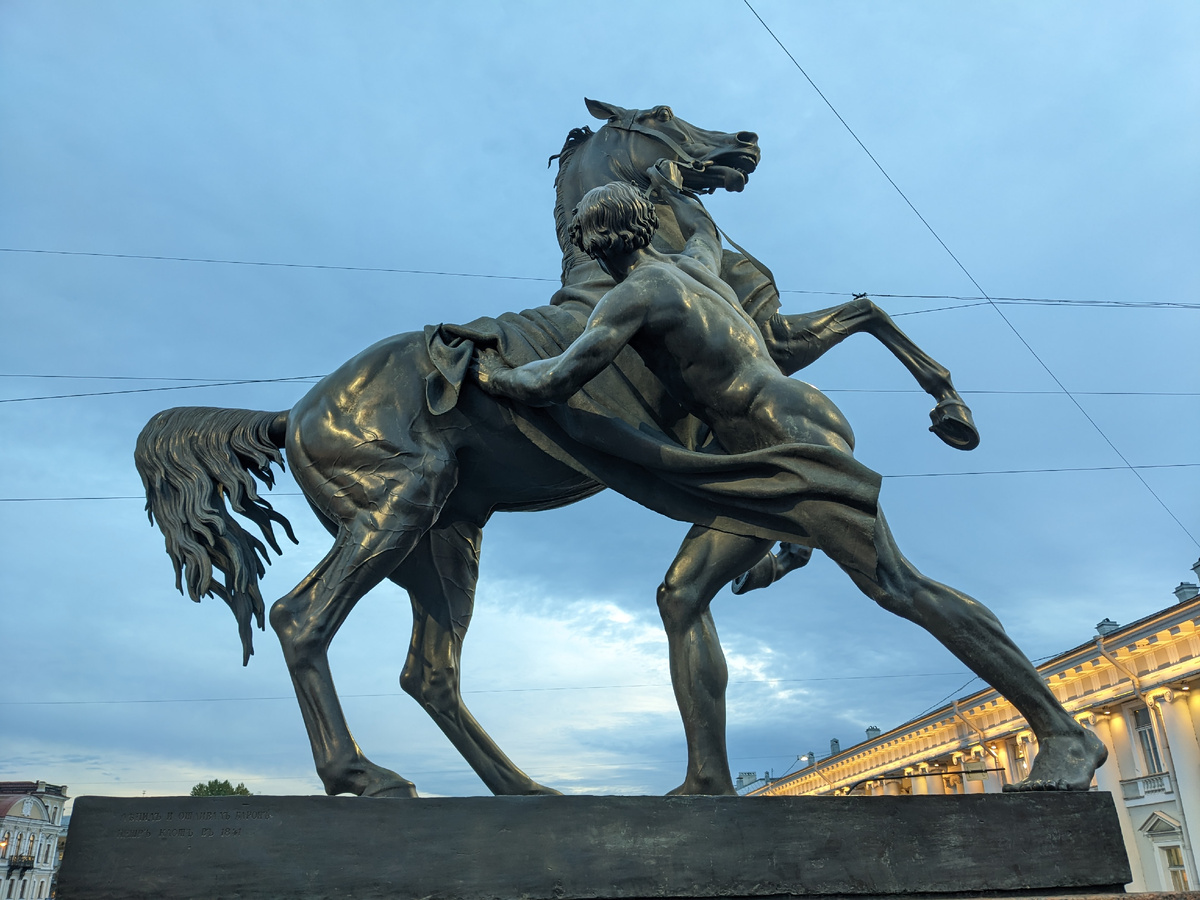 Эти красивые бронзовые статуи Петра Карловича Клодта стоят на Аничковом мосту. Появились они там в 1851 году. Изображают этапы покорения необъезженного коня человеком и символизируют борьбу человека с дикими, необузданными силами природы. Интересный факт: кони, обращенные в сторону Литейного проспекта, - без подков, а кони, повернутые в противоположную сторону (в сторону Адмиралтейства), - подкованы. Дело в том, что на Литейном проспекте располагались литейные мастерские и кузницы. Поэтому те лошадки, которые бегут от Литейного, уже обзавелись подковами, а те, которые только туда направляются, еще без них. Еще один интересный факт, касающихся коней Клодта. Во время блокады Ленинграда осенью 1941 года эти скульптуры были сняты и закопаны в саду Аничкова дворца, который расположен по соседству с мостом. Скульптуры для сохранности смазали тавотом и поместили в деревянные короба. Полностью погрузить их в промерзшую к тому времени землю не удалось, засыпали сверху. Старый садовник оберегал