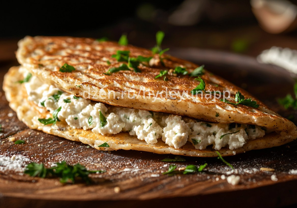 - Готовый овсяноблин снимите со сковороды, выложите на него творожную начинку, сверните пополам или в рулет.