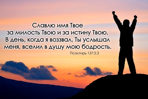 “Славлю Тебя всем сердцем моим, пред богами пою Тебе. Поклоняюсь пред святым храмом Твоим и славлю имя Твое за милость Твою и за истину Твою, ибо Ты возвеличил слово Твое превыше всякого имени Твоего” (ст. 1, 2).