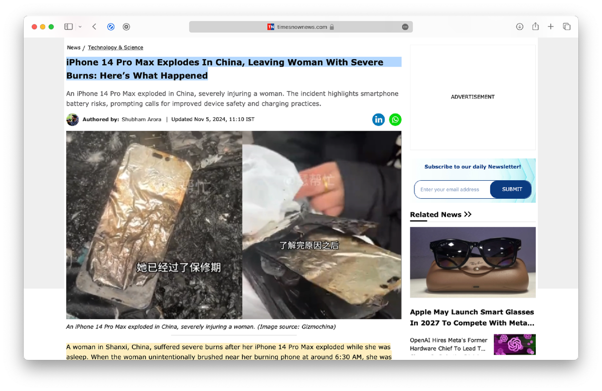 Фанаты Apple в тревоге: iPhone 14 Pro Max взорвался во время зарядки. Владелица устройства получила ожоги на руках и спине. Она заметила запах дыма и едва успела уйти в безопасное место. Проведенная экспертиза показала, что в айфоне действительно возгорание началось из-за аккумулятора.