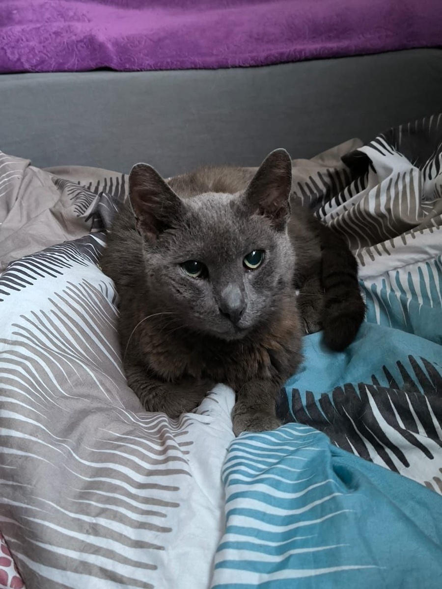 Расскажу вам сегодня для разнообразия ещë одну свеженькую счастливую историю. Я тут писала позавчера, что мы с Ларисой напряглись опять по поводу новой кошачьей задачи, а она возьми и разрешись сама собой (ну, почти, сравнительно). Несколько дней назад получаю от Ларисы взволнованное сообщение и вот такую фотку. К продуху соседнего со мной дома пришёл голубой кот. Явно домашний, контактный, в ошейнике от блох. Было видно, что возрастной и давно потерянный. Вëл себя странно. То ли шëл прямо на Ларису, то ли вообще куда глаза глядят. Как будто был слегка не в себе и просил о помощи. На предложение поесть отреагировал, но вяло. Лариса звонила мне, хотела попросить, чтобы я вынесла переноску, но почему-то не дозвонилась. Наша совместная деятельность в 2022 году, кстати, началась как раз у этого продуха, где мы ловили одного и того же кота не зависимо друг от друга, а потом объединили усилия. В итоге Лариса побежала сама домой за переноской. Вернулась, а кота уже на месте нет. Поискала,