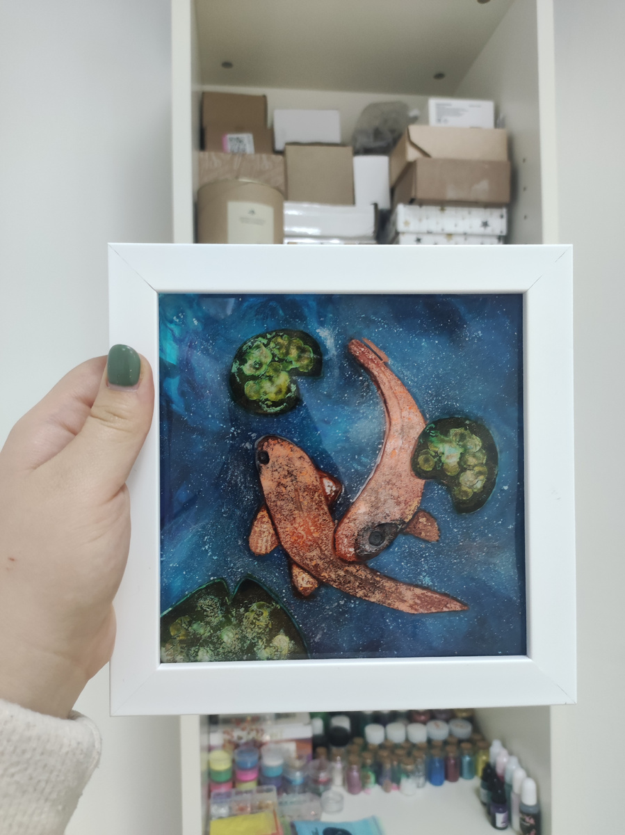 Хочется поделиться историей создания одной картины. Для начала, хочу сказать, что моим главным вдохновителем является МАШЕРИША. Подписана на Машу очень давно, у неё и увидела ролик про смесь контура, рамок и Петри. Тогда я ещё даже не занималась смолой, а просто смотрела и мечтала. Этим летом наконец взялась за этот проект, душа требовала оторваться от украшений и слегка пошалить) С самого начала был ступор: Какой контур? Какая рама? И прочее. Ещё было сложно выбрать рисунок, с которого буду делать "копию".Неожиданно для себя, выбор пал на этих рыб. Неожиданно, потому ,что вода совершенно не моя стихия, первая в речку не полезу, только в крайнем случае. Бассейн не люблю. Люблю горы, леса, цветы, листочки. Но Карпы Кои зацепили, решила не сопротивляться. По итогу работы, могу сказать, что довольна. Без косяков не обошлось. Контуром "я играла в 3д принтер", делая слои, в одном месте видимо получилась дырь и рыба слегка полиняла. Да и в целом, рыбы получились больше похожими на пия