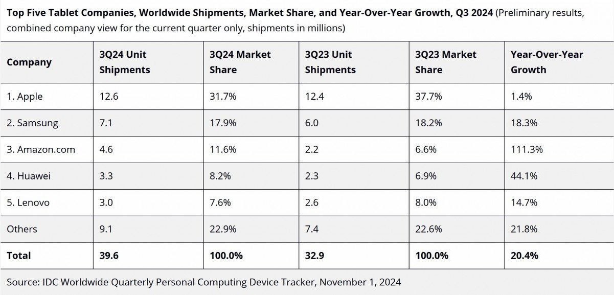 Рынок планшетов вырос на 20% за последний год. И хоть Apple увеличила продажи всего на 1,4% она все также остаётся лидером среди всех остальных. Samsung поднялся побольше, на 18,3% за год. При этом доля на рынке составляет впечатляющие 17,9%. Третье место по доле рынка занимает Amazon, компания в сегменте планшетов выросла аж на 111%! Huawei под санкциями вообще огонь. Целых 44% за год! Больше чем Samsung и Apple вместе взятые. При этом доля рынка неплохие 8,2%. Топ 5 замыкает Lenovo, о которой я давно не слышал. Странно что там не Xiaomi с топовыми решениями за маленькую цену 📨Телеграм|GalaxyBlog