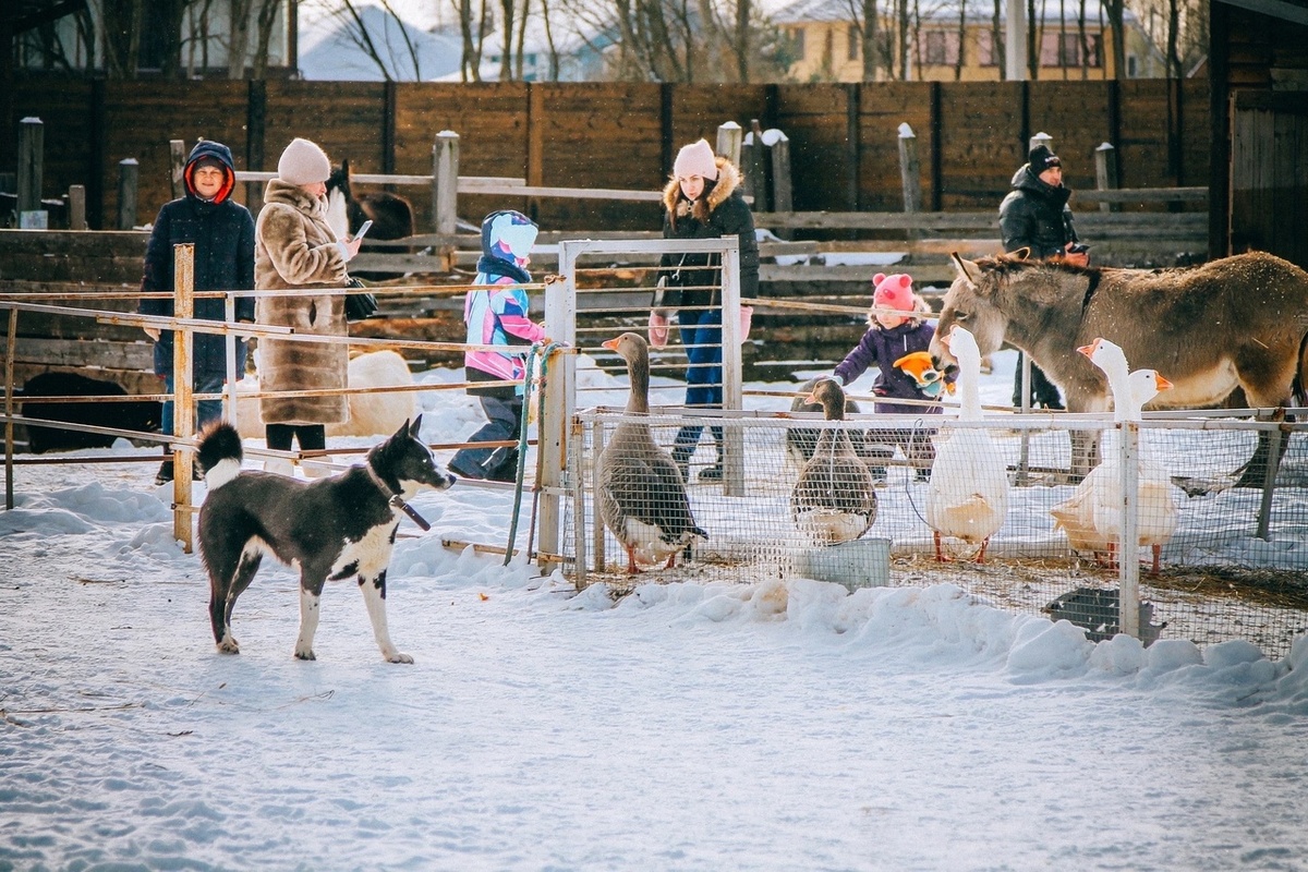 Поначалу на этом месте располагался контактный зоопарк. Сейчас на экоферме с атмосферным названием “Деревенька” живет около ста животных. Это куры, индюки, ослик, козы, кошки, собаки, гуси, кролики, мини-пиг, лошадка, страус, павлин и другие подопечные.