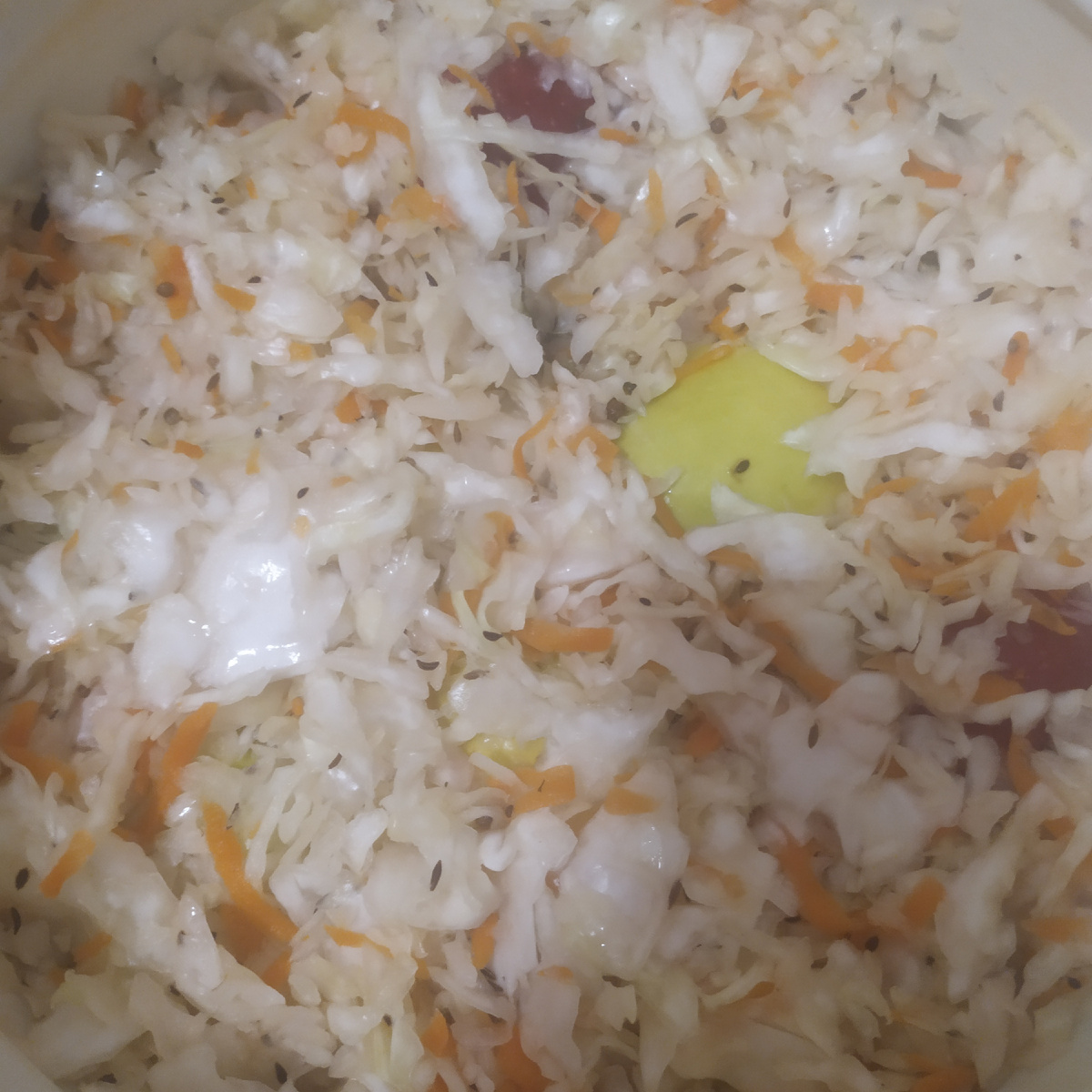 При изменении погоды сок в капусте может "уходить". В этом случае растворите в холодной кипячёной воде немного соли (попробуйте на вкус, он должен быть близок к солёности капусты) и просто долейте в ёмкость. Оставлять капусту без сока нельзя. Пропадёт! Если все-таки случилось так, что на поверхности капуста размягчилась или даже появилось немного плесени, удалите ЭТО до неповрежденных слоёв капусты и долейте солёную воду. И ещё. Плотно закрывать ёмкость не нужно, но очень желательно уменьшить площадь испарения влаги из ёмкости. Я элементарно прикрываю (не плотно) ёмкость п/э пакетом.