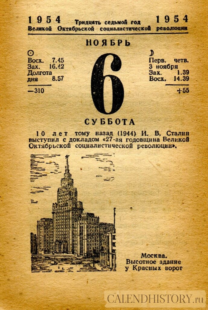 Итак, сегодня 6-го ноября и у нас на календаре 1954-й год. Перед нами листок советского календаря Политиздата. На календаре у нас суббота - 6 ноября 1954-го года. Москва. Высотное здание у Красных ворот 10 лет тому назад (1944) И. В. Сталин выступил с докладом «27-ая годовщина Великой Октябрьской социалистической революции». Оборотную сторону листка этого календаря можно посмотреть у нас по ссылке на сайте. Другие листки советских календарей смотрите у нас на сайте - CALENDHISTORY.ru