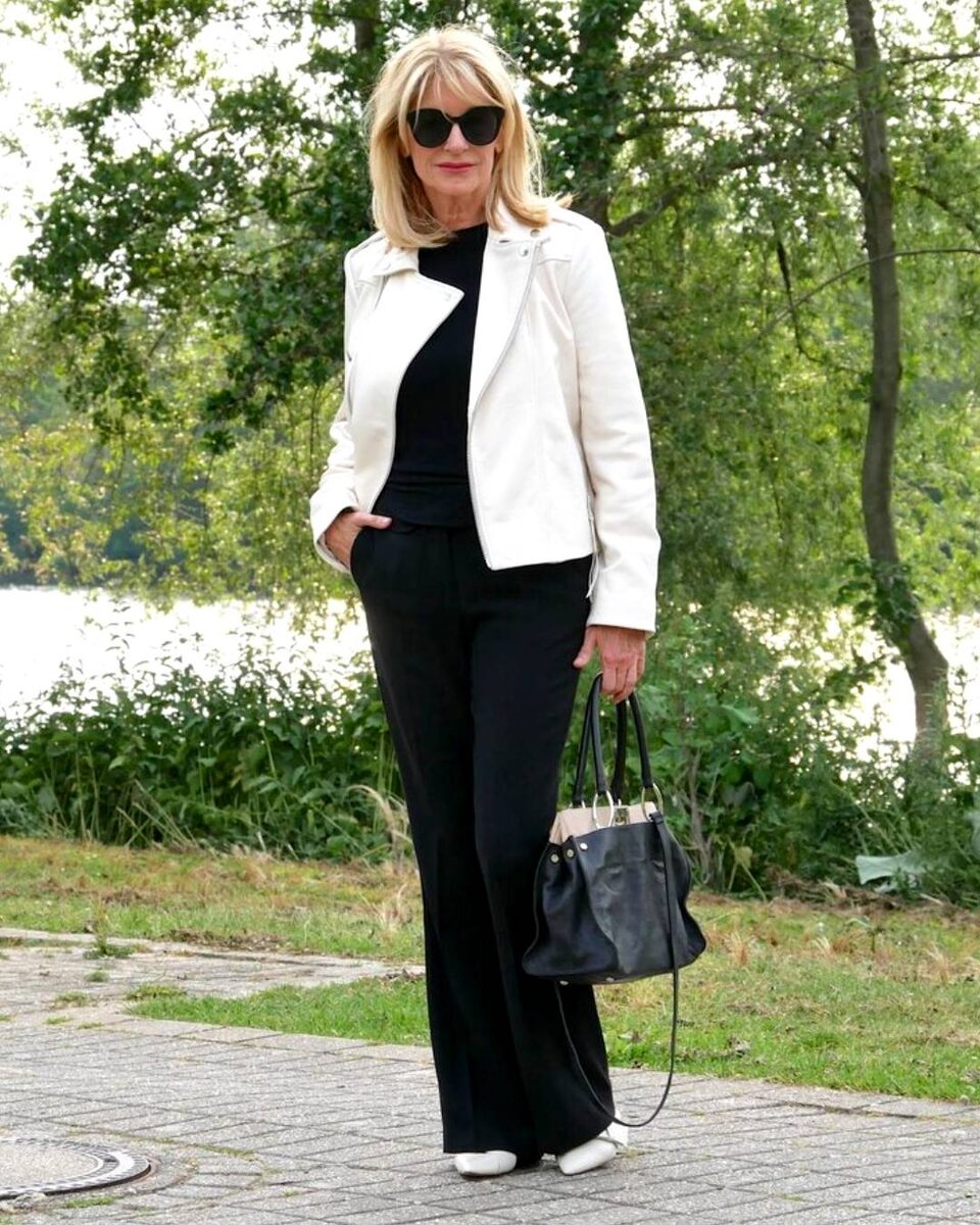 Наряд, состоящий из футболки с графическим рисунком и кожаных брюк, будет слишком дерзким для женщины 60+. Но выровнять баланс в этом случае можно с помощью базового свитера и однотонного пальто. А чтобы сделать образ минималистичным, достаточно надеть кожаные брюки с белой футболкой (без надписей и принтов) и удлиненным кардиганом.
