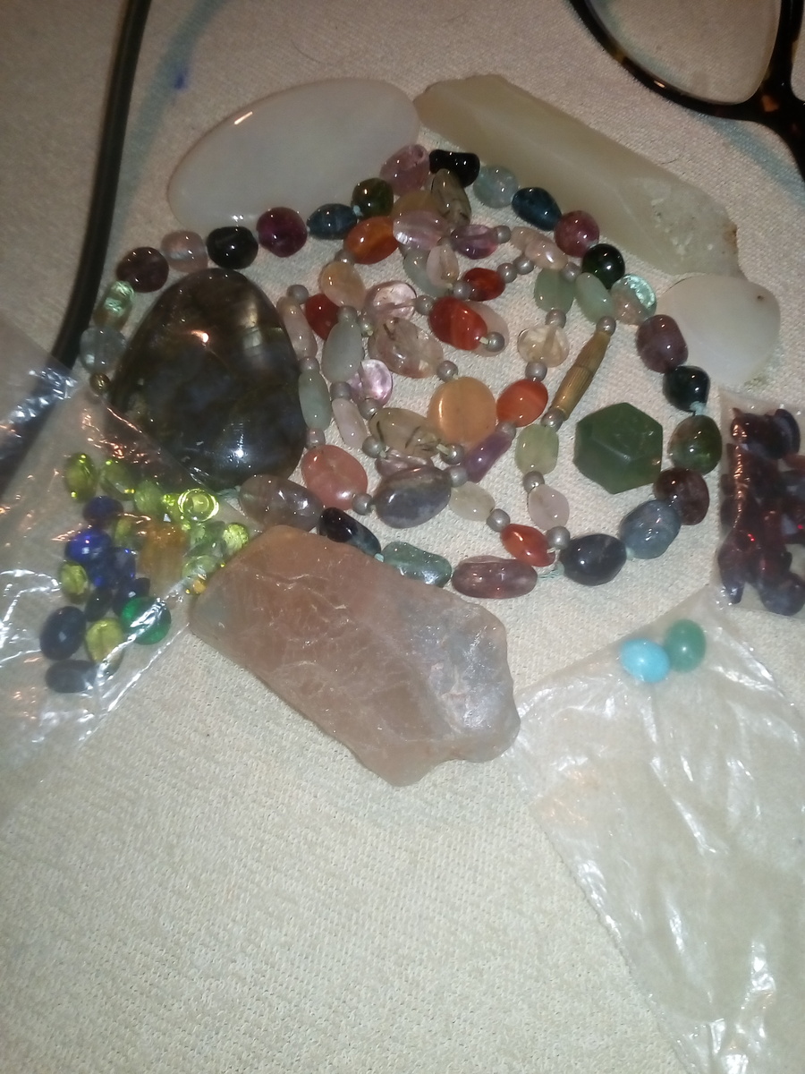 Что-то вспомнил про камушки. Разноцветные... В самом верху - три кусочка белого нефрита. В центре бусы из разноцветного кварца, вокруг нитка турмалинов. Окатыш лабрадора, кусок топаза... Зеленые в пакетике - хризолиты... Справа - гранатики. Короче, ничего ценного. Со вспышкой и без... А тут леченый перелеченый рубин и изумруд в серебре: