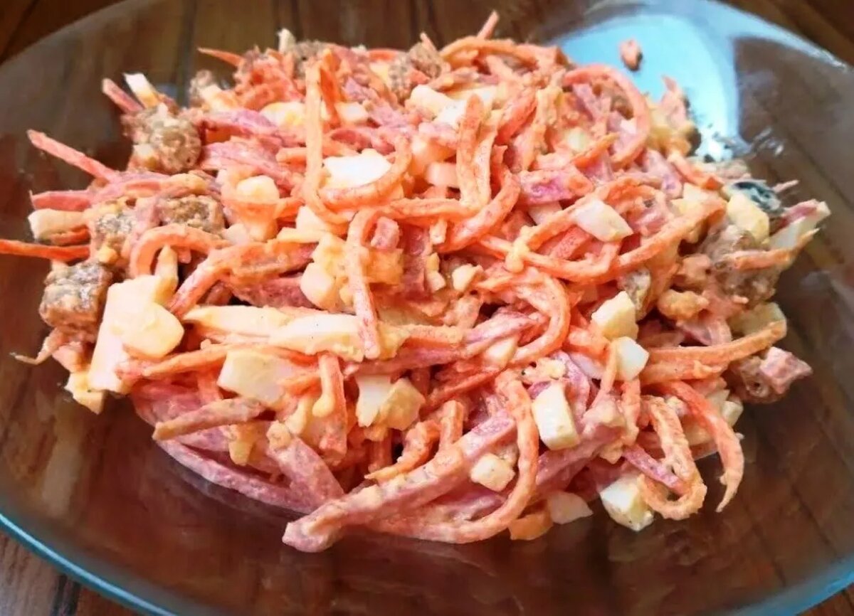По вкусу положите соль и чёрный перец. Если любите в салатах нотки пикантности, пропустите через чеснокодавилку один зубчик чеснока. Заправьте салат майонезом. Блюдо можно украсить веточкой свежей петрушки. Сырую морковь можно заменить готовой морковью по-корейски.
