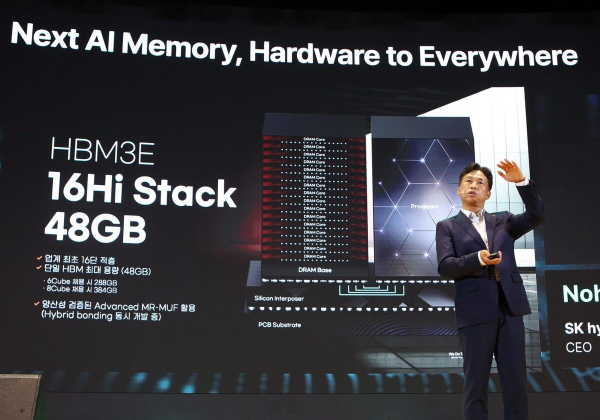 Компания SK hynix представила первую в мире память HBM3E объемом 16 гигабайт с 16 высотами, разработанную с использованием усовершенствованного технологического процесса MR-MUF. Эта новая память имеет емкость до 48 гигабайт на стек и является самой высокой по своей емкости и количеству слоев в отрасли для продуктов HBM. Образцы этой памяти будут представлены клиентам в начале 2025 года. Генеральный директор SK hynix, Квак Но Джун, представил эту разработку на мероприятии SK AI Summit 2024. Он поделился информацией о том, что компания разрабатывает память HBM3E объемом 48 гигабайт с 16 высотами, чтобы обеспечить стабильность технологии. Это позволит SK hynix оставаться на передовой практического применения памяти HBM. SK hynix также готовится представить твердотельные накопители PCIe 6.0. Предполагается, что эти накопители будут иметь высокую скорость передачи данных и дадут возможность увеличения производительности в компьютерных системах.Разработка новой памяти HBM3E и предстоящие тве