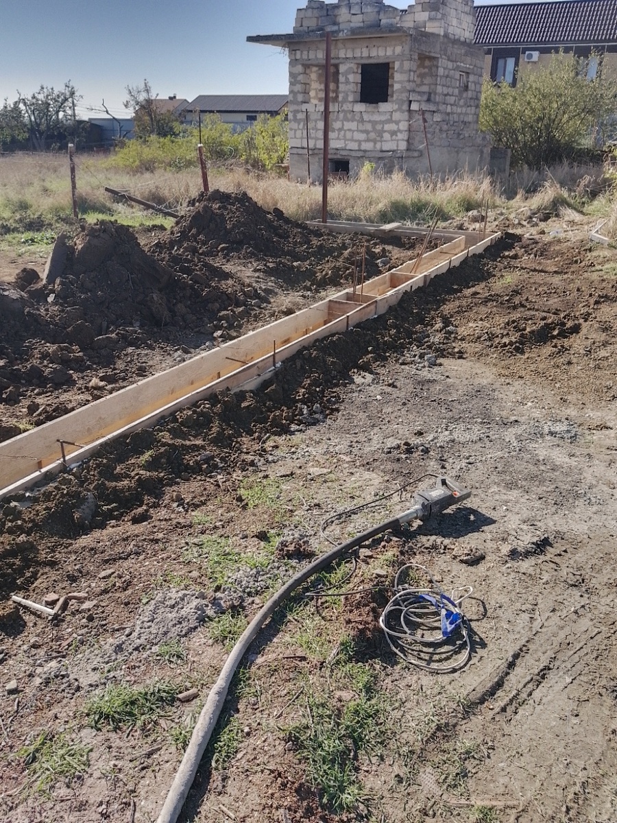 Здравствуйте! Пока сохнут обработанные доски для каркасного дома, решили заниматься заборами. Под один забор, таи где копали траншею, пришло время заливать бетон. Земля после дождей, скажем так, рыхловата, так что траншея не получилась аккуратной, да и рельеф участка такой, что пришлось бы опалубку выставлять на всю глубину траншеи, естественно потом ее оттуда никак не достанешь, а при нынешних ценах на пиломатериал, накладно. Так что решили залить в два этапа. Выравнивающий, в земле и вторым этапом, в опалубке. Так и сделали. Вечером залили основную массу бетона, что в земле, а глубина траншеи шестьдесят сантиметров, вторым этапом, с утра, поставили по быстрому опалубку и залили уже саму выравнивающую ленту под камни французского забора, шириной триста и глубиной в двести пятьдесят миллиметров. Все тщательно провибрировали и разровняли. Все, на какое то время об этом заборе нужно забыть. Тем более и похолодало еще довольно таки значительно. Не Сибирь конечно, но и не лето. Пусть