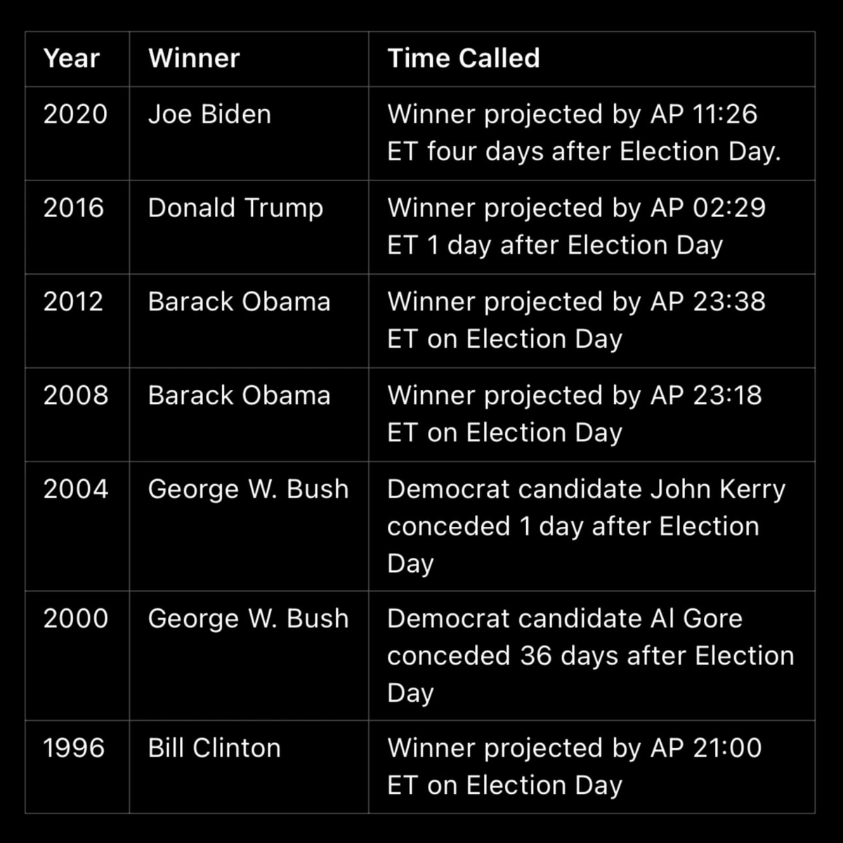 Давайте посмотрим на прошлые случаи, которые представлены на картинке (по материалам AP). В тексте время уже пересчитано из ET в московское: ◾️2020 Байден: Associated Press объявило победителя в 19:26, через четыре дня после дня выборов. ◾️2016 Трамп: Associated Press объявило победителя в 10:29 на следующий день после дня выборов. ◾️2012 Обама: Associated Press объявило победителя в 07:38 на следующий день после дня выборов. ◾️2008 Обама: Associated Press объявило победителя в 07:18 на следующий день после дня выборов. ◾️2004 Буш: кандидат от Демократической партии Джон Керри признал поражение на следующий день после дня выборов (примерно сутки с момента окончания голосования). ◾️2000 Буш: кандидат от Демократической партии Гор признал поражение через 36 дней после дня выборов. ◾️1996 Клинтон: Associated Press объявило победителя в 05:00 на следующий день после дня выборов. ➡️ В итоге очень вероятно, что мы узнаем имя следующего президента США уже в четверг, где-то в 6-8 утра по Москв