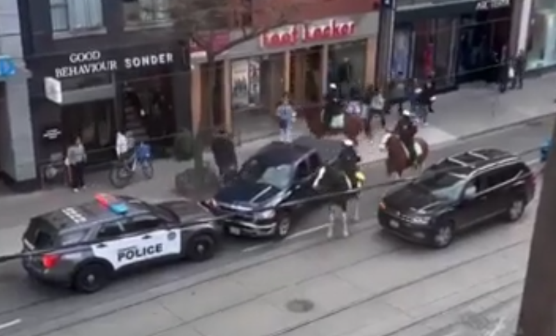 В Сети появилось видео, запечатлевшее отчаянные попытки водителя огромного черного пикапа Ram 1500 скрыться от полиции. Инцидент произошел в Торонто (Канада). Поймать преступника удалось объединенными силами конной и дорожной полиции. Очевидцы сняли на видео финал эпичной погони, когда преступника уже практически удалось загнать в угол – на одну из узких городских улочек. Но он не сдавался до самого конца. С одной стороны пикап Ram 1500 заблокировали полицейский автомобиль и три сотрудника конной полиции, а с другой – еще два полицейских автомобиля. В отчаянной попытке скрыться угонщик протаранил витрину магазина, выскочил из машины и попытался убежать, но был пойман. Как сообщили в местном управлении полиции, угонщиками оказались 33-летний Джонатан Дерозье и его 30-летняя подруга Сидар Николас, которая выскочила из пикапа за несколько секунд до эпичного тарана. Обоим предъявлены обвинения в угоне, опасном вождении, порче имущества, нападении на полицейских и жестоком обращении с живот