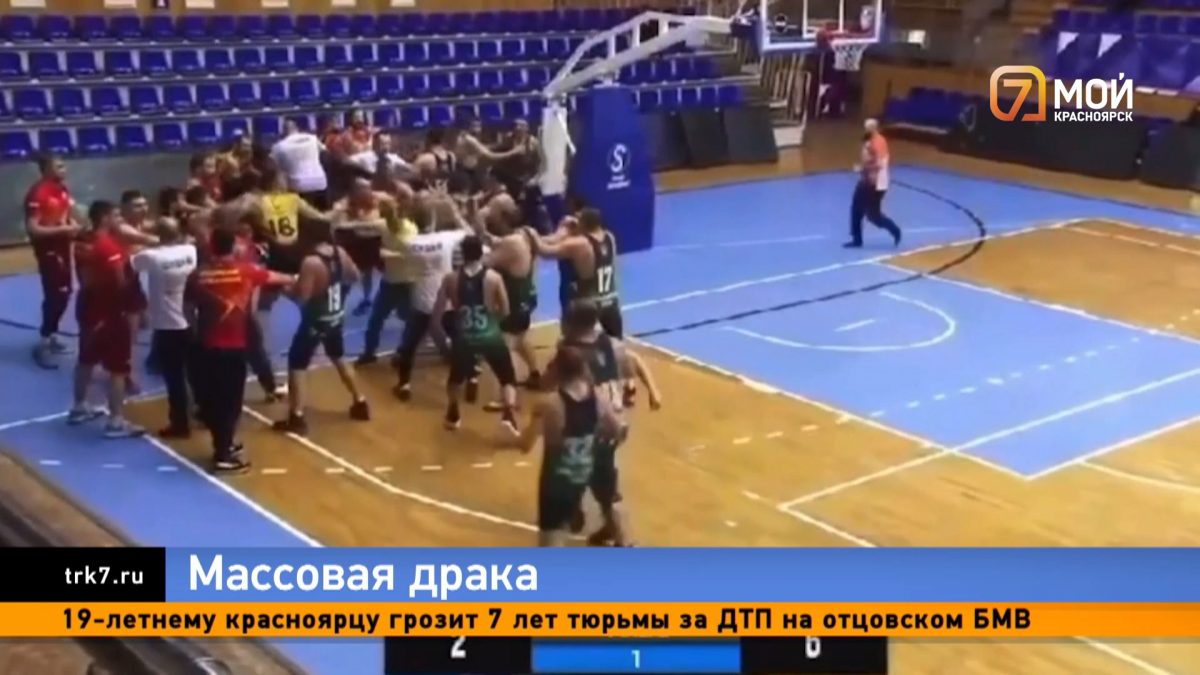 Массовая драка в финале чемпионата России по регболу. Это вид спорта, который объединяет баскетбол, регби и борьбу. Во время матча сборных Красноярского края и Чувашии у спортсменов не выдержали нервы. После очередного точного броска игрока нашей команды, соперники набросились на него. Сначала они начали толкаться, а потом в ход пошли кулаки. Помимо игроков, в потасовку вмешались еще и зрители. На площадку выскочило около пятидесяти человек. Как только конфликт прекратился и его участники успокоились, матч продолжился и закончился победой нашей команды.