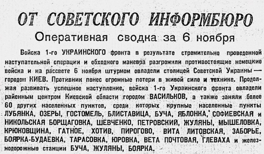 … Занятие этого города советскими войсками является победой, имеющей огромное не только военное, но и моральное значение. Обозреватель напоминает, что, когда гитлеровцы заняли Киев, они хвастливо заявляли, что это повлечёт за собой полнейшее поражение советских войск на всём юго-востоке. Теперь, заявляет обозреватель, времена изменились. Германия слышит звон похоронного колокола. На неё надвигается лавина. Другой лондонский радиокомментатор напоминает, что, когда гитлеровцы вступили в Киев, германское командование утверждало, что немцы навеки овладели этой твердыней. Спустя два года советские войска с треском вышибли захватчиков из города.