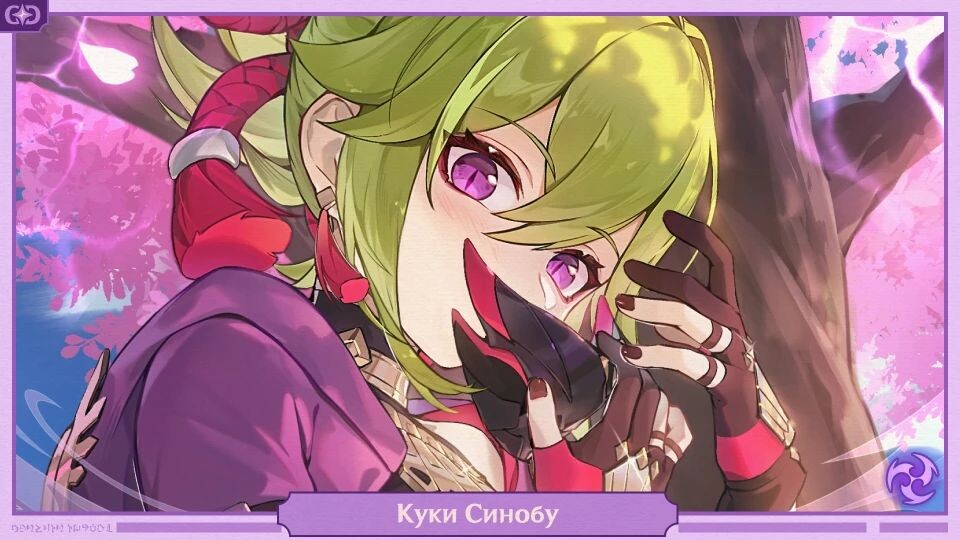 ㅤКуки Синобу — Электро персонаж, владеющий одноручным мечом. В первую очередь она хилер, и даже если прокачивать её полностью в мастерство стихий в некоторых отрядах, её лечения, как правило, достаточно.