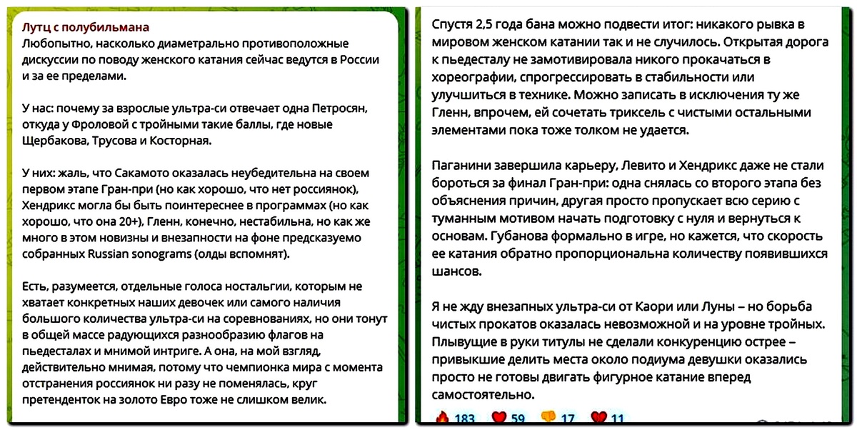 Канал "Всем Лутц", как-то написал: "Ужасно надоело писать про конгрессы и всякие переносы турниров. Не канал, а какой-то боевой листок ISU, ей богу", - и это 23.06.2024 г., когда конгресс уже далеко позади, да и не нарешал ничего исторического, кроме поднятия возрастного ценза и разрешения сальто в программах. Потому что предложенные изменения, за которые под давлением верхушки ISU при отключенном электронном тайном голосовании проголосовали депутаты Конгресса, вступят в силу после Олимпиады 2026, если только вступят, поскольку функционеры решили собрать внеочередной форум ровно через год".