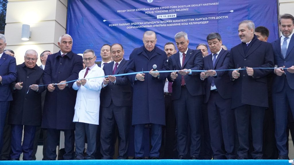 Түркиянын президенти Режеп Тайып Эрдоган Кыргызстан менен Түркиянын кызматташтыгынын символу катары Бишкек мамлекеттик кыргыз-түрк достук ооруканасына барып, аны ачты. Оорукана 2021-жылы ишин баштаган жана буга чейин ийгиликтүү операцияларды, анын ичинде трансплантацияларды жасаган. 🇰🇬 Түркиянын президенти Режеп Тайып Эрдоган Бишкек мамлекеттик ооруканасында болуп, кыргыз-түрк мамилеси чыңдалып жатканын көрсөттү. 🏥 Сапар 5-ноябрда Эрдогандын Кыргызстанга болгон мамлекеттик сапарынын алкагында болуп, ал өзүнүн ысымын алып жүргөн ооруканадагы медициналык тейлөөнүн шарттары менен таанышты. 🤝 Оорукананын ачылышы Кыргызстан менен Түркиянын ортосундагы кол коюлган келишимдер менен башталган бекем кызматташтыктын символу. 🩺 Мекеме өз ишин 2021-жылдын октябрь айында баштаган жана буга чейин ийгиликтүү операцияларды, анын ичинде бөйрөк жана боорду алмаштырууну жасаган. 🏆 2024-жылы сентябрда эки тараптуу мамилелерге кошкон салымы үчүн Эрдогандын ысымы ооруканага ыйгарылган.